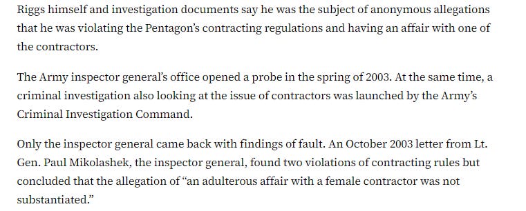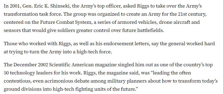 During the course of this research, I identified the Lieutenant General who was the subject of the investigation: John M. Riggs. He was the Director of the Objective Force Task Force at the time of his retirement, responsible for creating a high-tech Army for the 21st century and transforming the US Army. Riggs served on active duty with the US Army for over 39 years before becoming an Aviation & Strategic Defense Consultant. He retired in 2005 with a loss of rank due to "misuse of contractors."