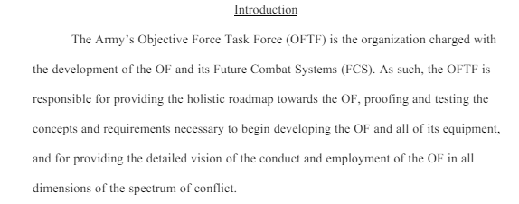 According to a technical report hosted on the DTIC website titled Training Chrysalis: Applications of Special Forces Training in the Development of the Objective Force, the purpose of OFTF was to lead the development of the Objective Force and its FCS (Future Combat Systems).