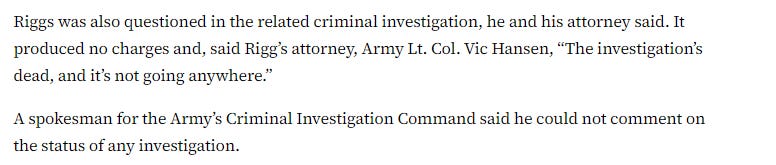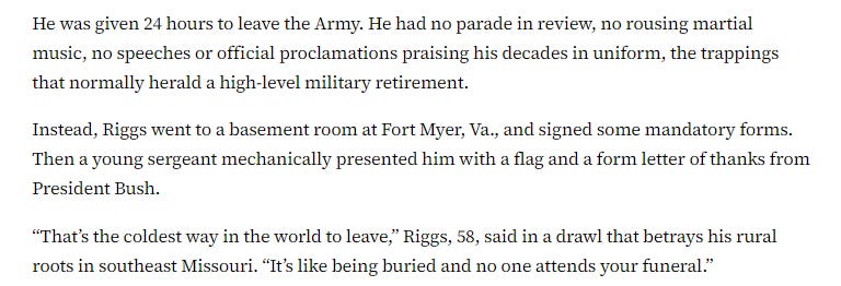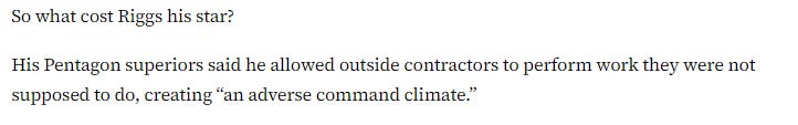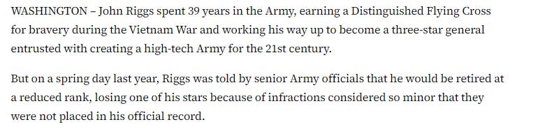 According to the article, Riggs was told by senior Army officials that he would be retired with a reduced rank because of "infractions considered so minor that they were not placed in his official record." The fact that a three-star General was abruptly and unceremoniously retired, losing a rank over something not even documented in his official record, suggests there may have been more significant underlying issues.