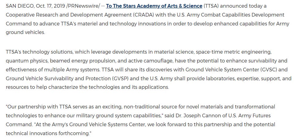 The last part of this story is that the actual material in which General Riggs exposed his contractor aide (that he may or may not have been having an affair with) was something of non-human origin. How could we possibly officially reference something like this? These programs are supposedly above the law and deeply classified. One way is to look at where something that was publicly alleged to be potentially "non-human" went when the government obtained it. This brings in TTSA (To The Stars Academy of Arts & Sciences). They obtained a piece of material that they believed to be of non-human origin, and through government contacts, former AATIP Director Lue Elizondo facilitated the transfer of this material into the US Army's hands.