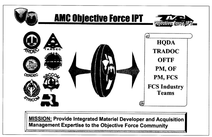 "To focus on the Objective Force, the AMC Commanding General has established a Technology Integration Board (TIB) and an AMC OF Integrated Product Team (IPT). The TIB is composed of the Technical Directors from the AMC RDECs, the ARL Director, the AMC Deputy Chief of Staff for Research, Development and Acquisition (DCSRDA), and the Assistant DCSRDA/Science and Technology (S&T) Advisor. The TIB provides broad guidance to the AMC OF IPT."