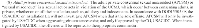 The involvement of the Army Criminal Investigation Division in investigating an alleged consensual relationship raises further questions. According to Army Regulation 195-2, the Army CID only involves itself in allegations of 'Adult Private Consensual Sexual Misconduct' (APCSM) when there are aggravating circumstances; otherwise, such matters would typically be investigated by the Army Inspector General.