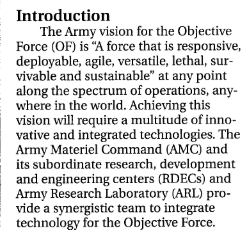 The Army's main vision for the Objective Force was to create a force that was 'responsive, deployable, agile, versatile, lethal, survivable, and sustainable' anywhere in the world. Achieving this would require innovative technology developed from Army Materiel Command (AMC), Research, Development, and Engineering Centers (RDECs), and the Army Research Laboratory (ARL).