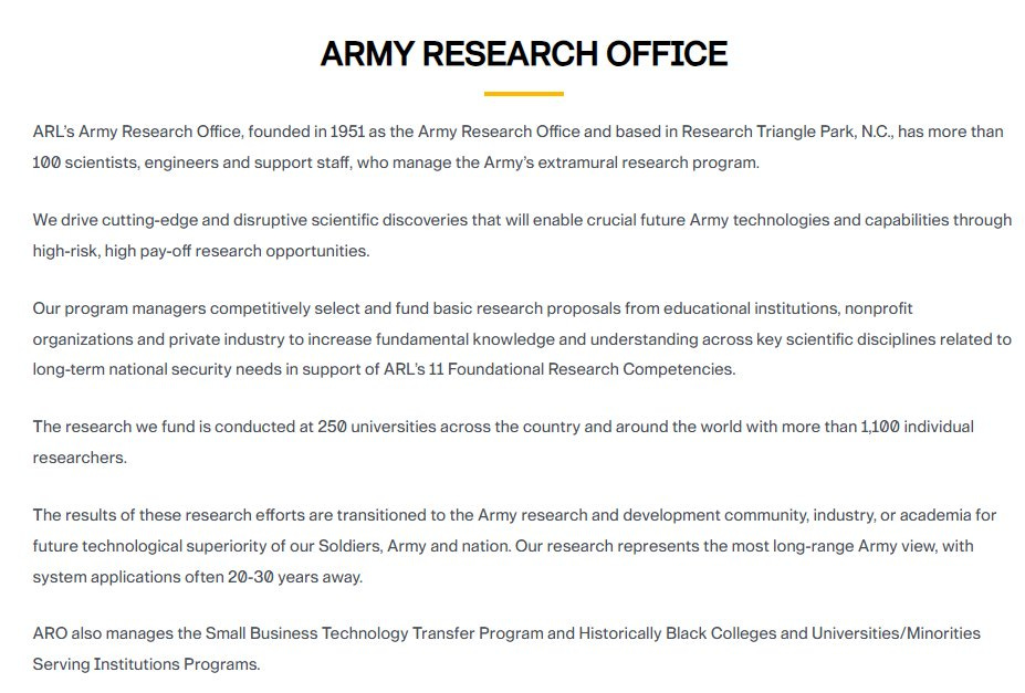 Another official reference point to Source 0's claim is mentioned: one of the locations of this exotic technology is at Research Triangle Park. That is the location of the Army Research Office (ARO), under the auspices of the Army Research Laboratory.