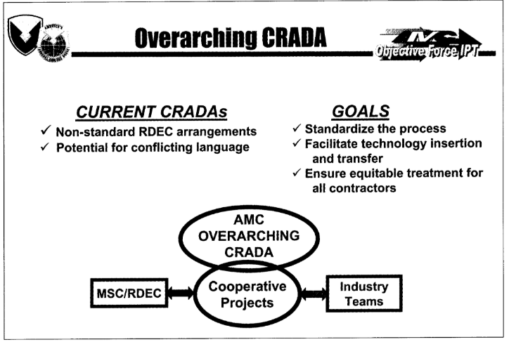 "The second effort is the overarching CRADA (Figure 2). The purpose is to standardize and streamline the business arrangements between the AMC RDECs and the FCS industry teams. The overarching CRADA will include corporate business arrangements common to all RDECs, yet will still provide flexibility to accommodate individual industry teams. Potential common business arrangements include exchange of data, trademarks, patents, inventions, joint inventions, and proprietary and protected information. Under the umbrella of the overarching CRADA, cooperative projects will be negotiated between the RDECs and FCS industry teams in coordination with AMC Headquarters. The cooperative projects will include business arrangements specific to the RDECs. Potential specific business arrangements include scope of work, personnel resources, transfer of funds, testing, and test facilities. The overarching CRADA will encourage government and industry teaming and will ensure equitable treatment for all participants."